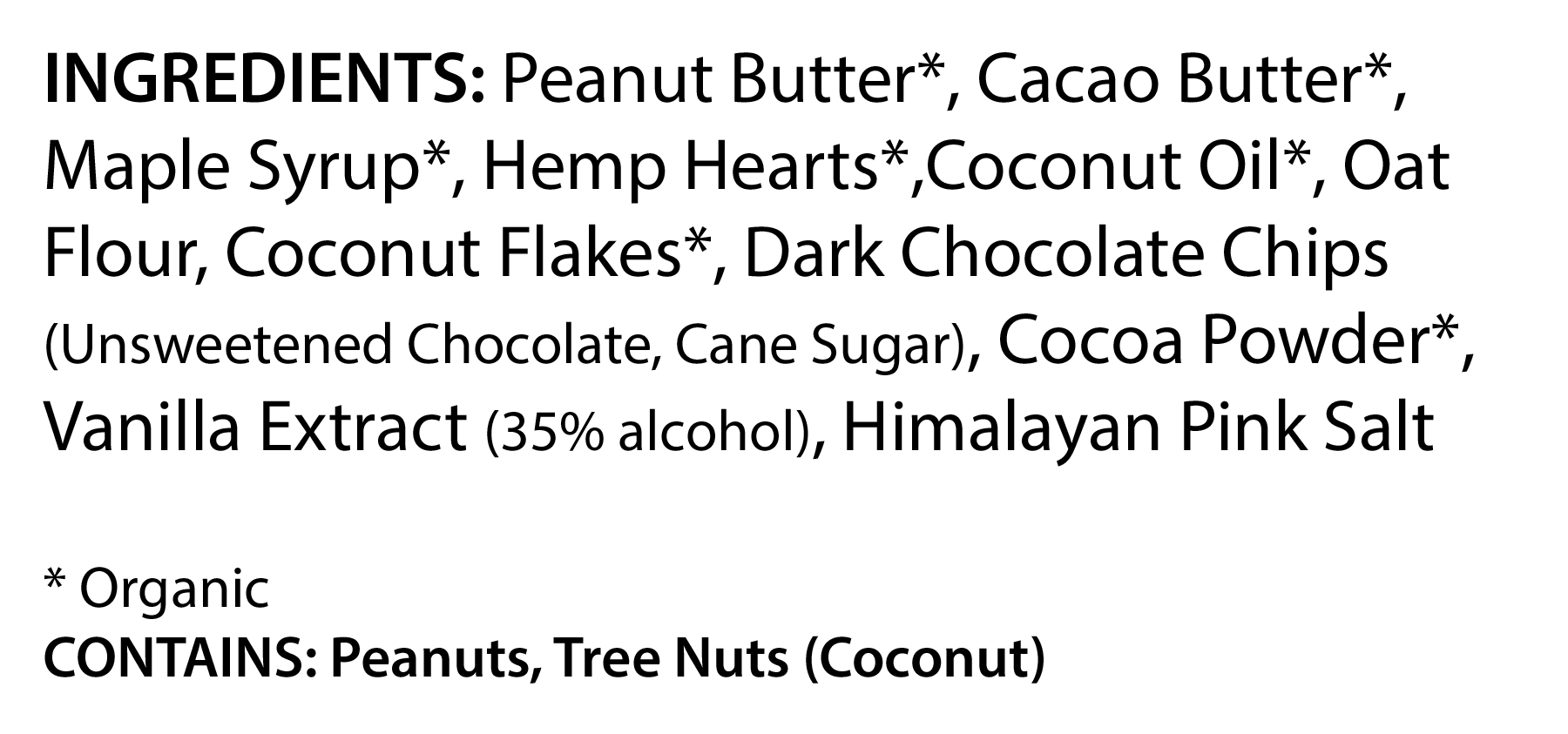 Ingredients: Peanut Butter*, Cacao Butter*, Maple Syrup*, Hemp Hearts*, Coconut Oil*, Oat Flour*, Coconut Flakes*, Dark Chocolate Chips (Unsweetened Chocolate, Cane Sugar), Cocoa Powder*, Vanilla Extract (35% alcohol), Himalayan Pink Salt